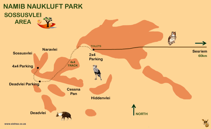 It is about 66 km past the Sesriem gate. The last 6 km can only be traversed with 4WD vehicles as the gravel road ends and sand begins (the place where the gravel road ends and all non-4WD vehicle must stop there). Sossusvlei is a clay pan, covered in a crust of salt-rich sand.